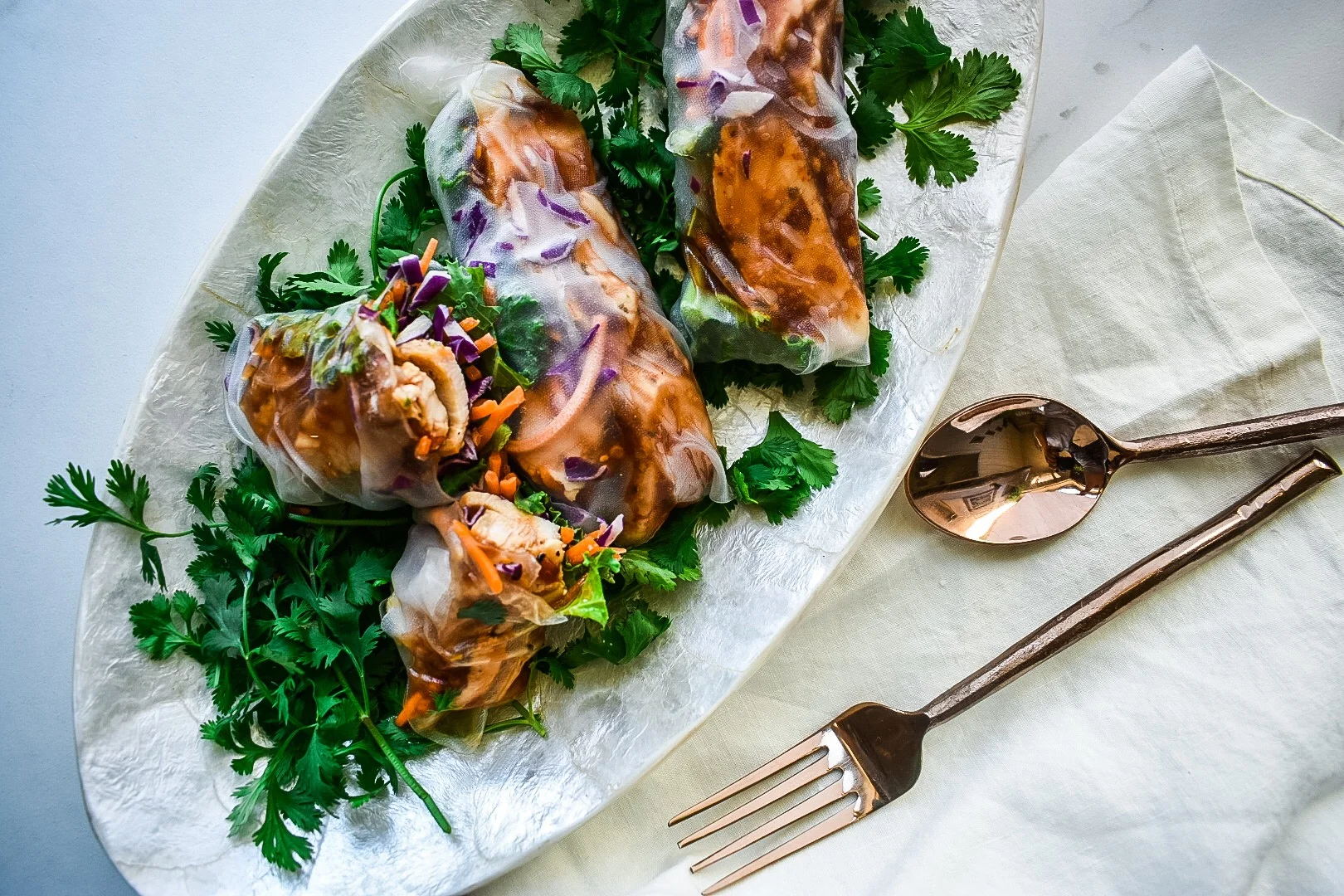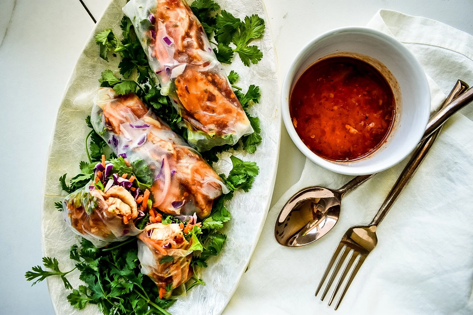 For my summer rolls and stir fry, I made a great hoisin/chili garlic sauce. Itβs super easy, and requires: fresh orange, chili garlic sauce, hoisin sauce, Thai basil, lemongrass, ginger, garlic, sesame oil, sambal oelek (Thai and Malaysian ground chili paste) and a squeeze of lime. I donβt remember the measurements, but I threw all of those ingredients in a small pot and cooked it on low for about an hour. You can increase the heat using more chilies or add a pinch of sugar or honey for extra sweetness. This sauce is great on wings, fish or tofu.
